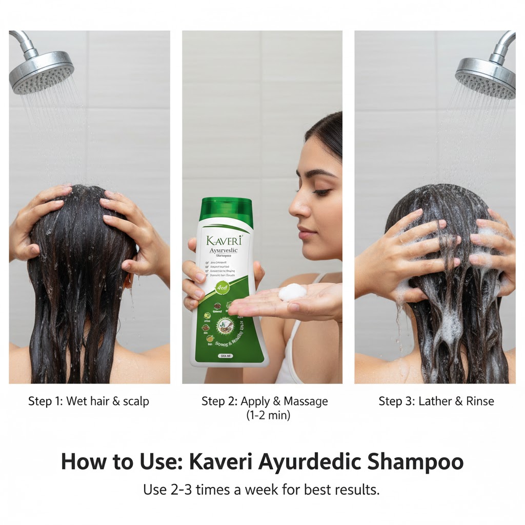 - Take a small amount of Kaveri Ayurvedic 4-in-1 Shampoo in your palm.