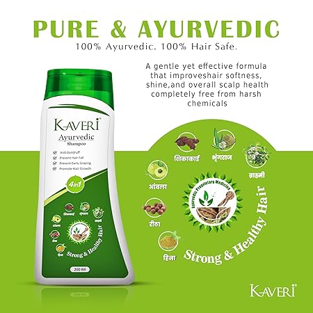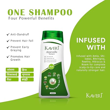 Kaveri Ayurvedic Shampoo 4-in-1 – Anti Dandruff, Hair Fall Control, Prevents Early Greying & Promotes Hair Growth – With Amla, Shikakai, Bhringraj, Reetha & Neem – 200 ml