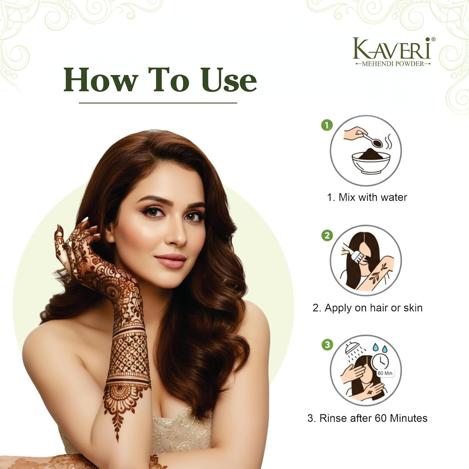 Easy To Use - Mix kaveri mehendi powder with water in a non-metallic bowl. Apply on your hair or for design on hand & feet. Leave it for 1-2 hours. Wash thoroughly with clean water.